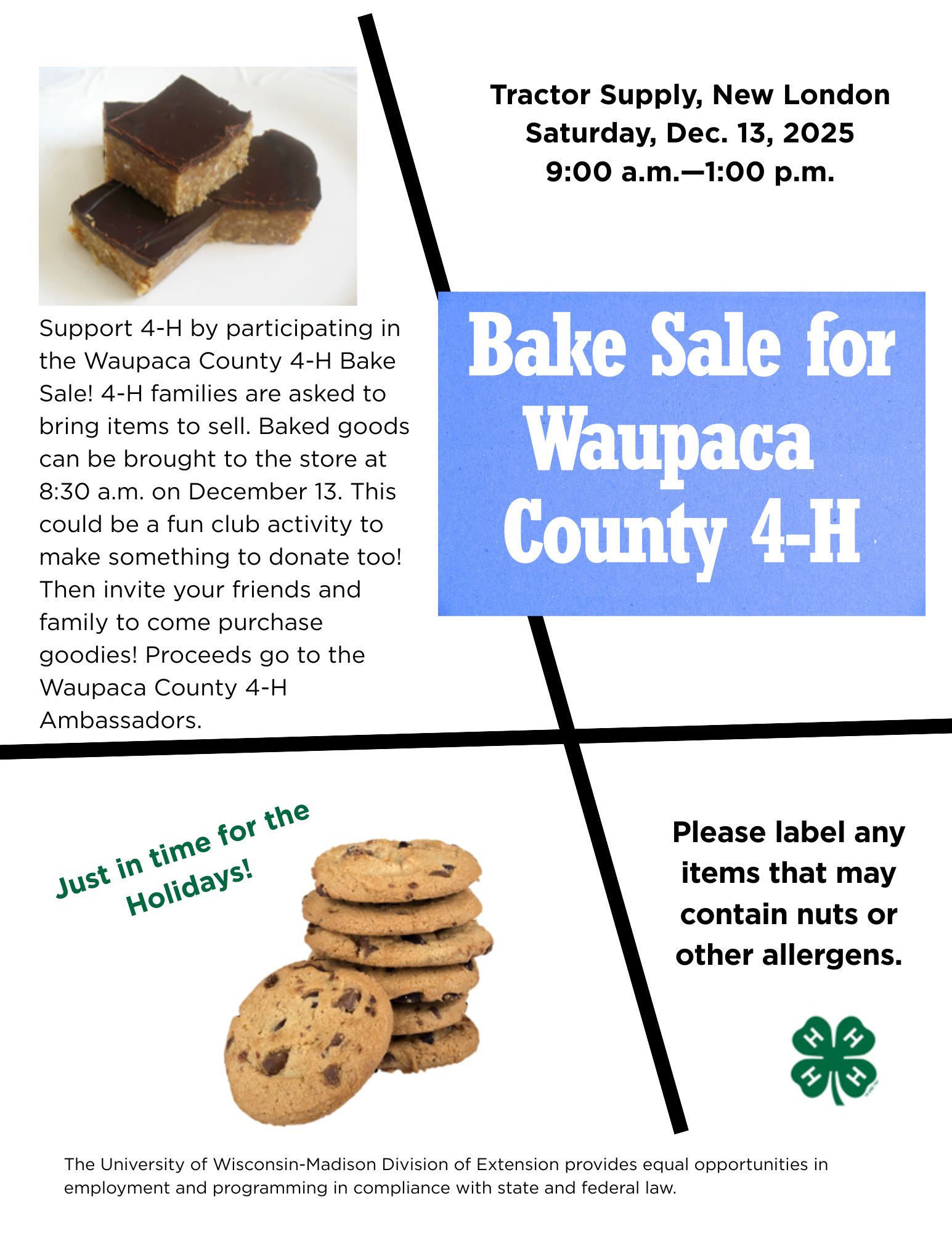 - Bake Sale for Waupaca Co 4-H -Saturday, December 13, 2025. Tractor Supply Store in New London