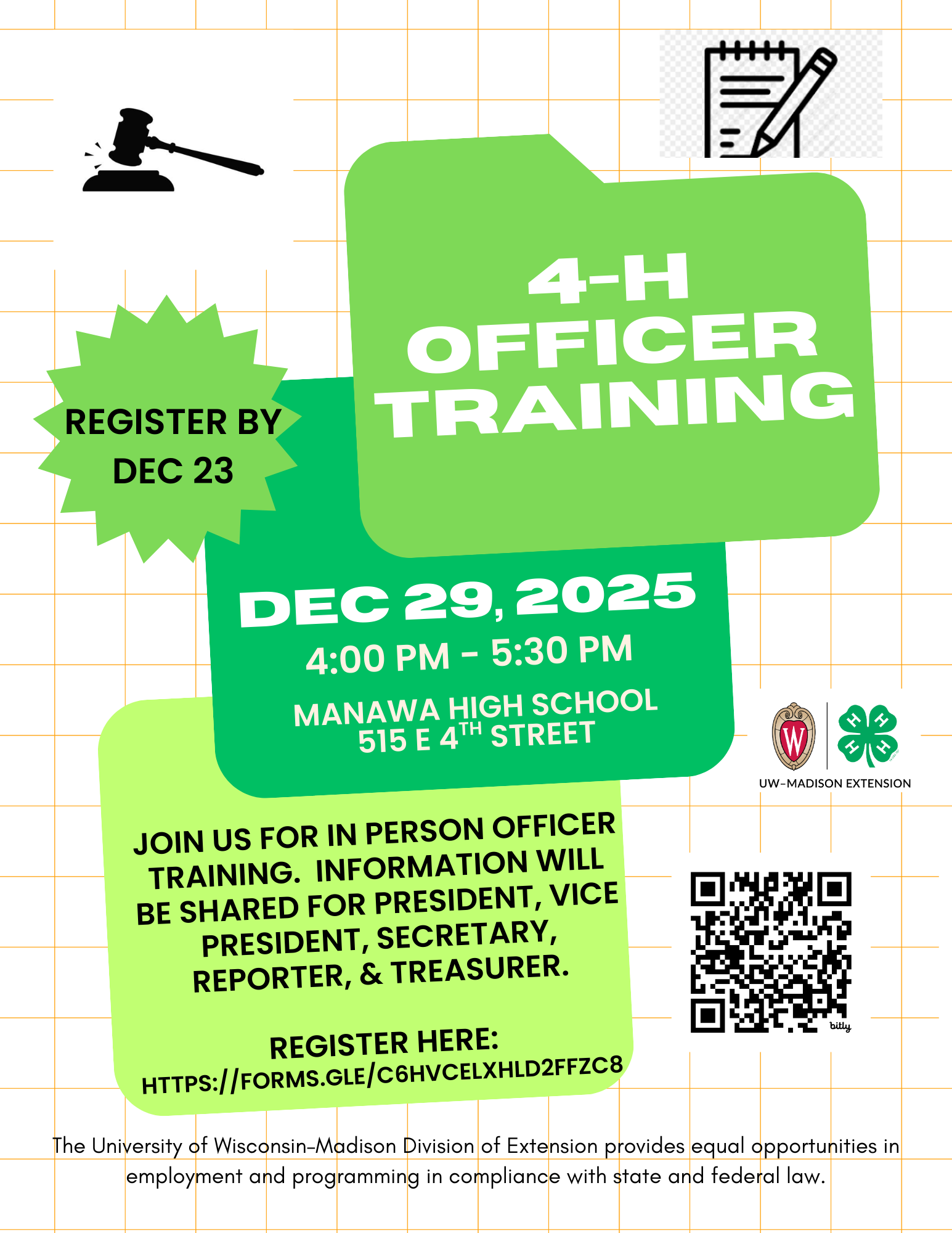 - 4-H Club Officer Training – December 29, 2025. 4:00 – 5:30 at Manawa High School. Register here.