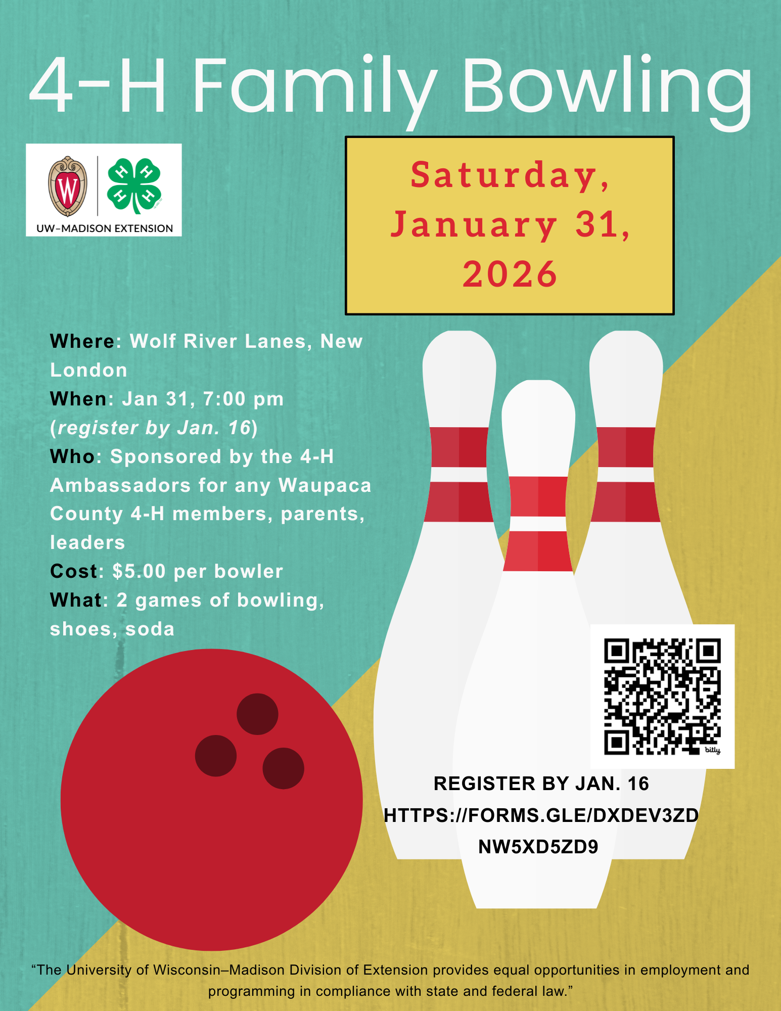 - 4-H Family Bowling – Saturday, Jan. 31, 2026, in New London. Click flyer for details and link to register by Jan.16