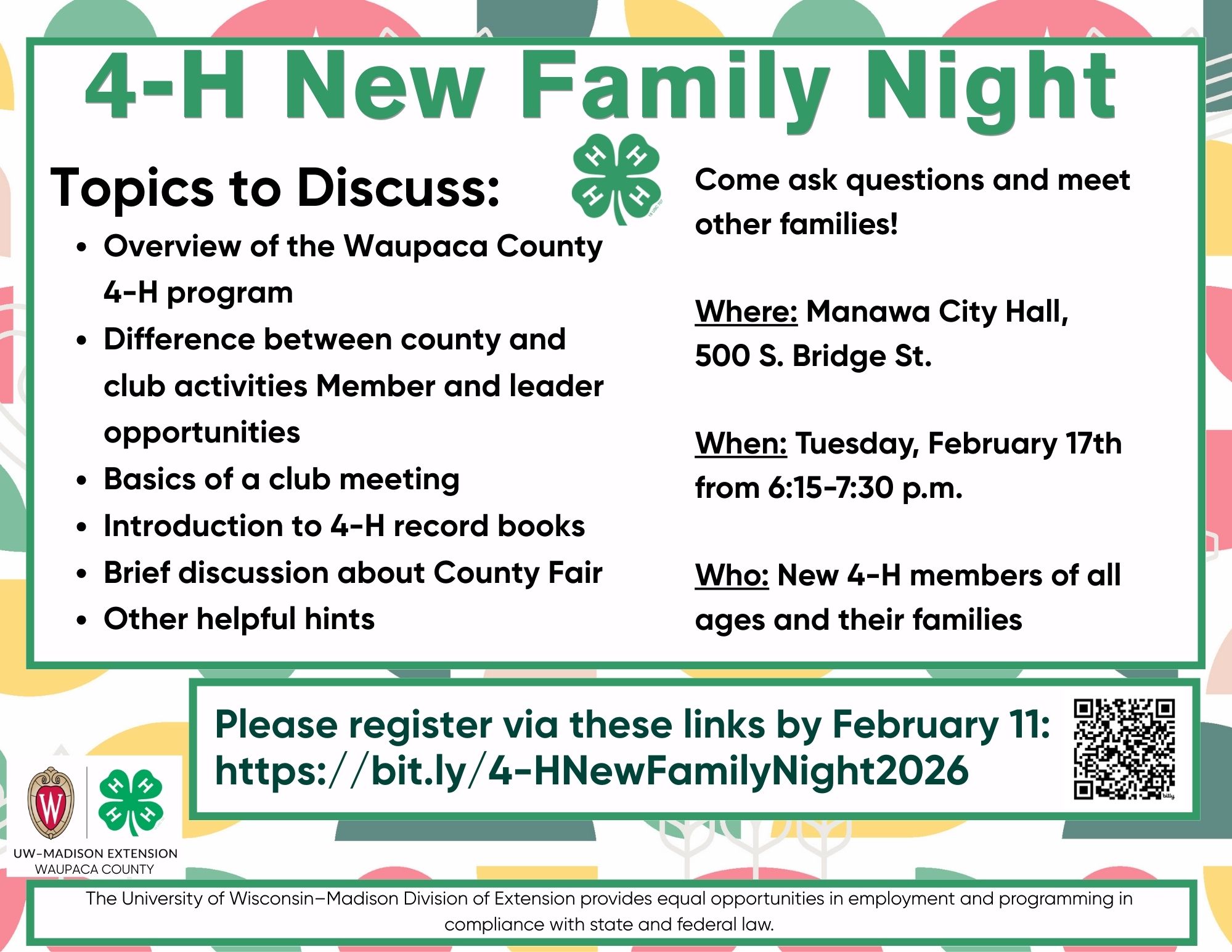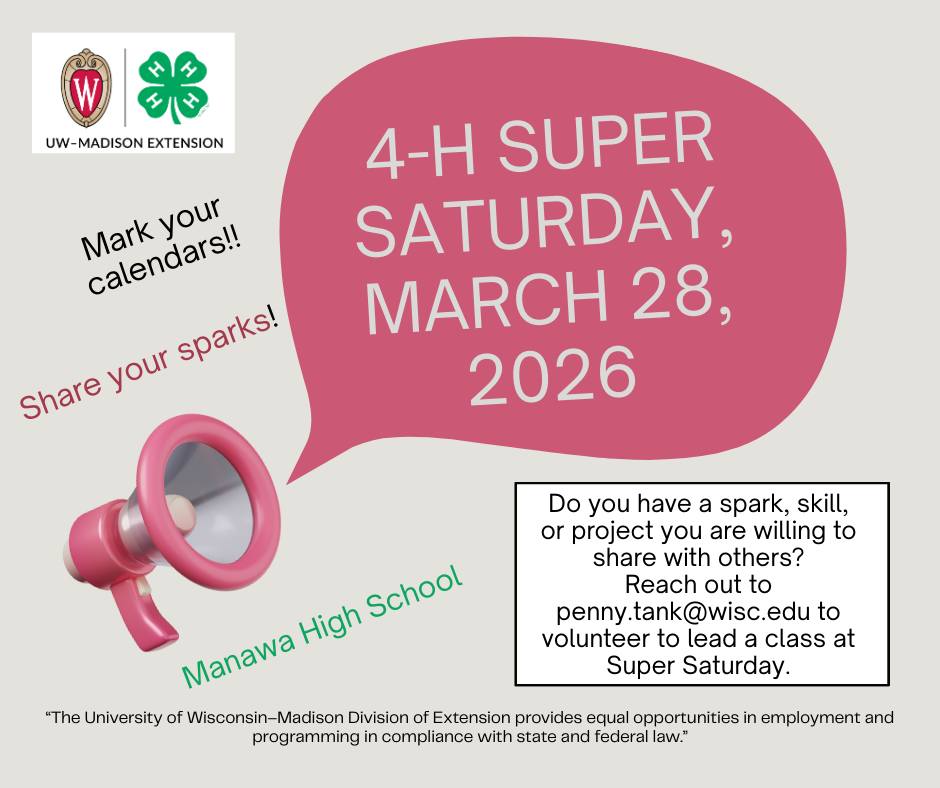- 4-H New Family Night – Tuesday, Feb 17th, 2026, Manawa City Hall. Click link to pre-register.