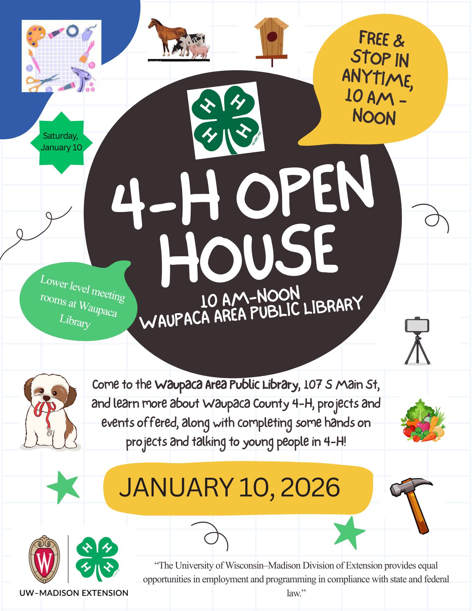 - 4-H Open House – January 10, 2026, at the Waupaca Library from 10:00 – 12:00